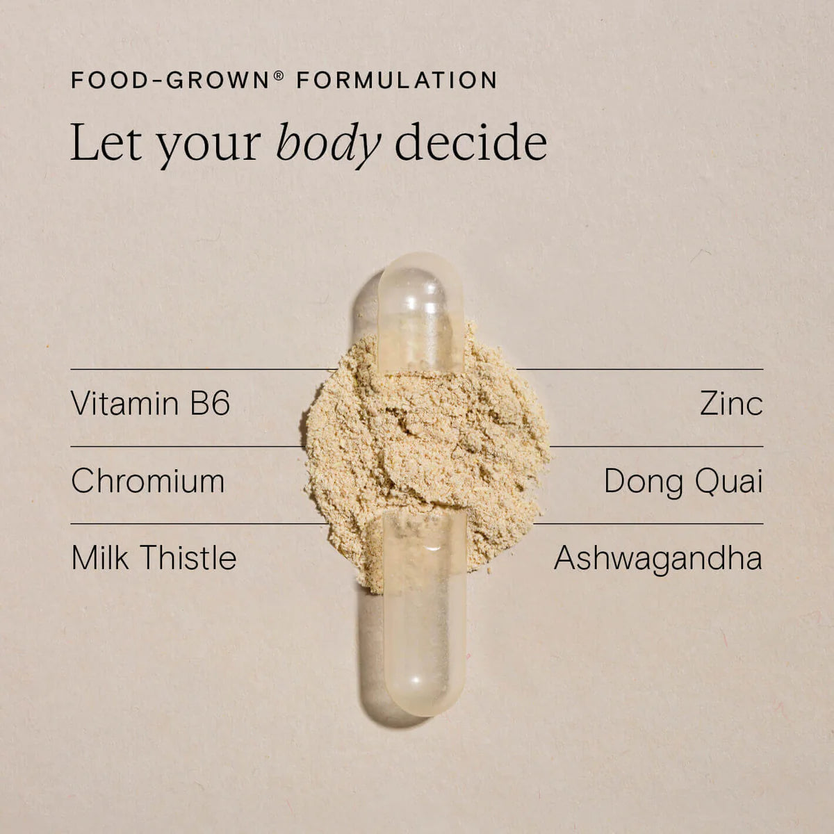 Tento komplex byl odborně sestaven, aby podporoval ženský cyklus po celý měsíc ale hlavně ve dnech před menstruací: výkyvy nálad, narůstající chuť k jídlu, zadržování vody či únava. Látky Food-Grown® jsou kompletně přírodní a pro tělo tak lépe vstřebatelné a využitelné než jejich často používané syntetické formy. Vitamíny, minerály a další účinné látky jsou pěstovány na speciální pastě z celistvých potravin.