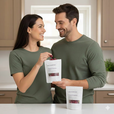 Tyto bonbony obsahují Vitamín D, který byl derivován z lišejníku což je rostlinná alternativa k tradičnímu Vitaminu D3, vhodná pro vegany, která nabízí stejné výhody pro zdraví kostí a imunitní funkce. Je to udržitelná a etická volba pro osoby, které hledají neživočišný zdroj této nezbytné živiny.